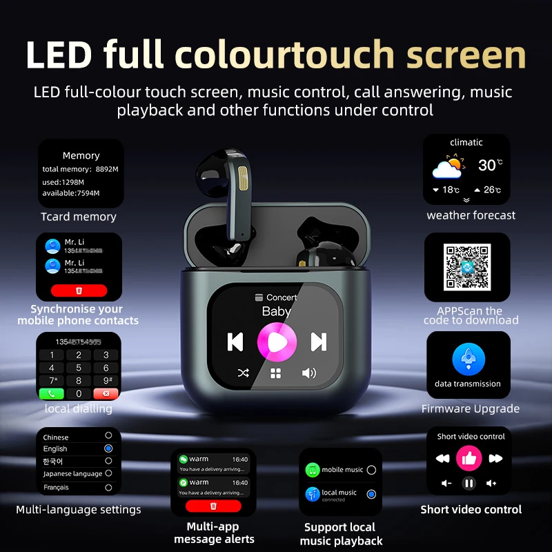 TWS Screen Display Wireless Active ANC Noise-canceling Earbuds, Smart Touch Screen Wireless Earbuds, Noise-canceling Wireless Earphones, Long Battery Life, Built-in SD Card With MP3 Playback
